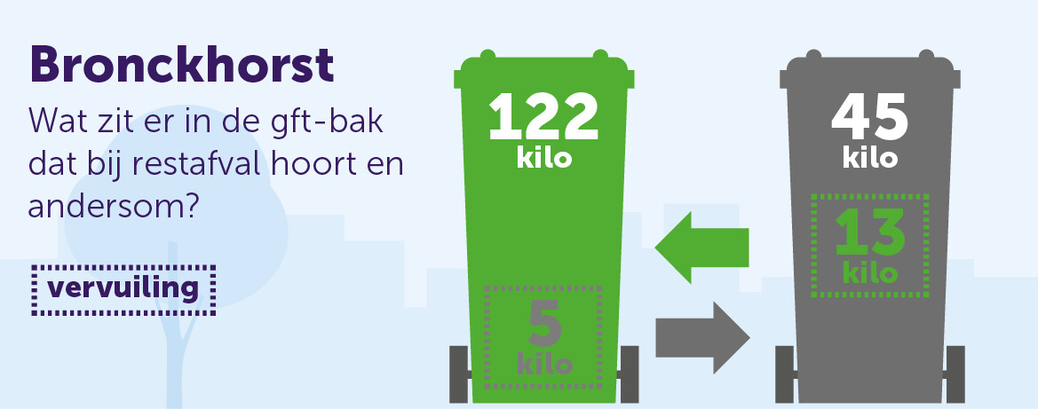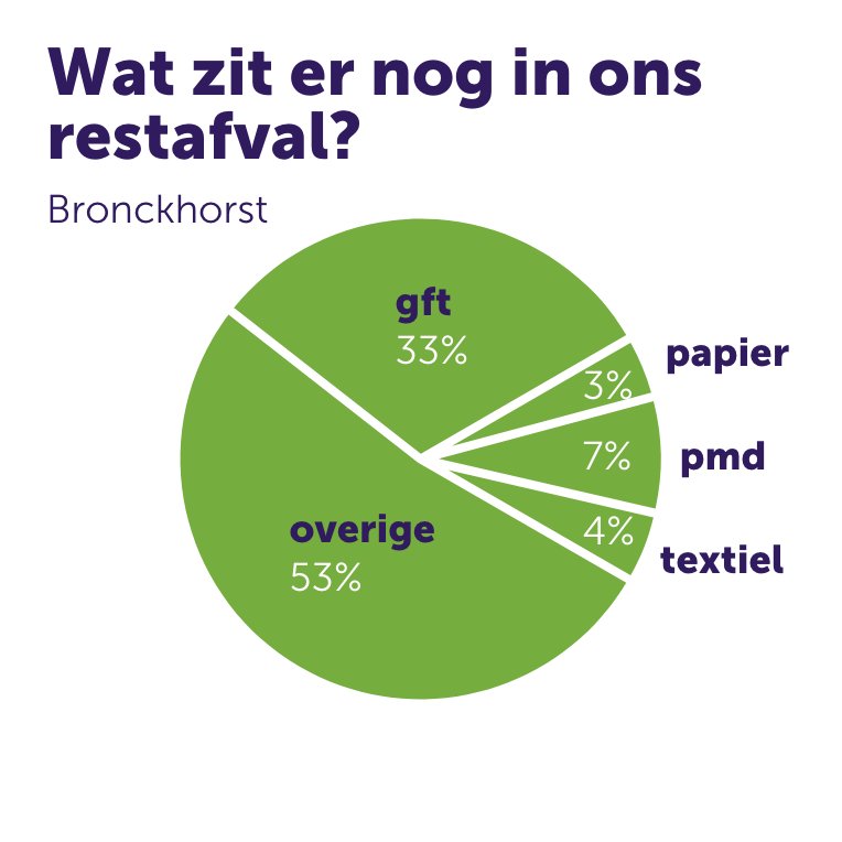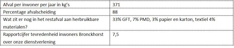 Bronckhorst laat de laatste vier jaar elk jaar een stijging zien van het scheidingspercentage van 2%. In 2021 bedroeg dit maar liefst 88%, waarmee Bronckhorst het hoogste afvalscheidingspercentage heeft in ons werkgebied. Er is nog wel winst te boeken: in het restafval zien we nog altijd een flink aandeel grondstoffen, vooral GFT en in mindere mate PMD, textiel en papier. Andersom trouwens ook: in PMD en GFT zien we afval dat elders hoort. De komende jaren zal kwaliteit van grondstoffen aandacht vragen.
