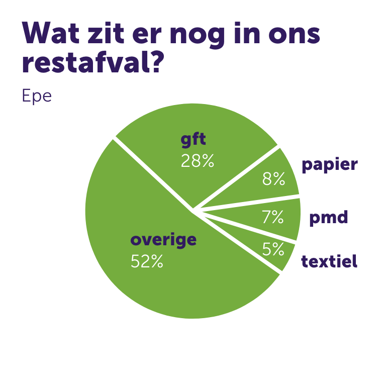 De gemeente Epe laat in 2021 een forse stijging zien van het scheidingspercentage met 10%. Het scheidingspercentage bedraagt in dat jaar 80%. Daarmee behoort Epe tot de koplopers in ons werkgebied. Er is nog winst te boeken: in het restafval zien we nog altijd een flink aandeel grondstoffen, vooral GFT en in mindere mate PMD, textiel en papier. Andersom trouwens ook: in PMD en GFT zien we afval dat elders hoort. De komende jaren zal kwaliteit van grondstoffen aandacht vragen.