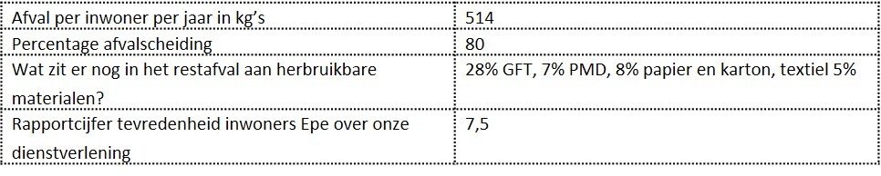 De gemeente Epe streeft naar een betere scheiding van grondstoffen en een verdere reductie van het restafval. Het grondstoffenbeleidsplan Samen Slim Inzamelen kwam in 2019 tot stand met een actieve bijdrage van inwoners door middel van onder meer huiskamergesprekken. Doel van het plan: in 2025 uitkomen op 30 kg restafval per inwoner.