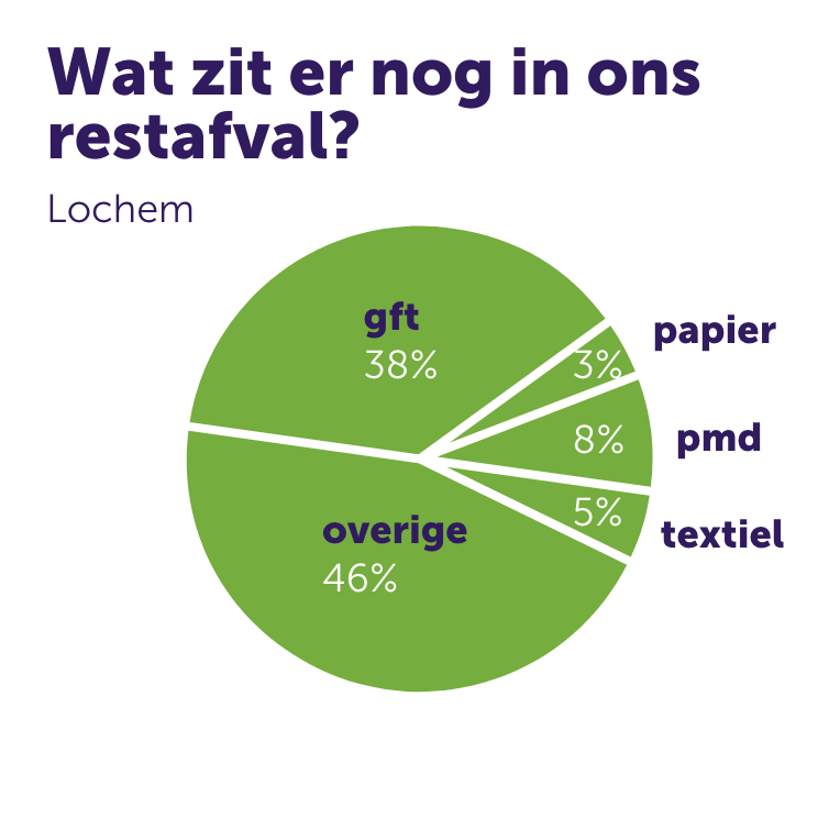 Lochem laat de laatste vier jaar een lichte stijging zien van het scheidingspercentage. In 2021 bedroeg dit 76%. Er is nog winst te boeken: in het restafval zien we nog altijd een flink aandeel grondstoffen, vooral GFT en in mindere mate PMD. Andersom trouwens ook: in PMD en GFT zien we afval dat elders hoort. De komende jaren zal kwaliteit van grondstoffen aandacht vragen.